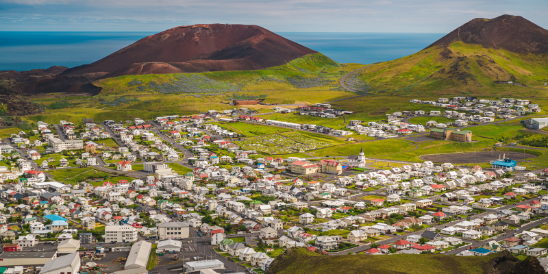 Just off the south coast of Iceland is a series of small islands called Vestmannaeyjar, or the Westman Islands. The largest of these and the only inhabited one is called Heimaey, or “Home Island”, and it is a sweet home to 4,500 people and about 8 million puffins. Heimaey is a breathtakingly beautiful island and its awesome landscapes are a sight to behold. But this place is best known for the 1973 eruption of its volcano EldfellLink opens in a new tab that took out half the town and significantly enlarged the island. In what can only be described as a miraculous moment in history, the entire island was immediately evacuated during the night. Today, visitors can walk around houses excavated from the ash in the Eldheimar volcano museum in Vestmannaeyjar and learn all about its geological superstar neighbor, Surtsey.